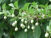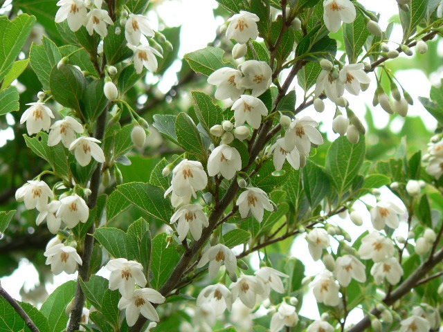 葉が小さく、幹・枝が繊細な樹です。初夏にベルの形をした可憐な白い花がたくさん咲き、その後ぶら下がる実がなります。ピンクの品種(ピンク・チャイム)もあり、株の立ち姿がとてもキレイで、冬でも黒いなめらかな幹肌の樹形を楽しむ事ができ、式を通じて楽しめる1本です。