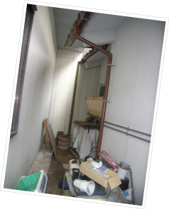 脱衣所の壁の向こう側は、雑然とした物置スペースでした。浴室を改装した際に、脱衣所の腰高窓は出入りができる掃出し窓に取り替えられました。