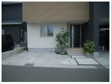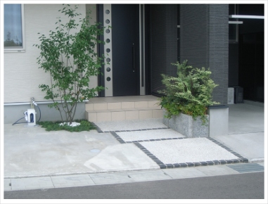 アプローチは黒のピンコロで縁取り、