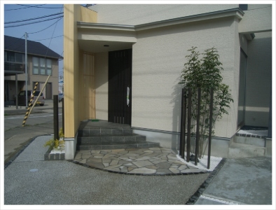 角地の建つお家。その正面からは見えませんが、通行する人や車の視界には必ず入ってくる場所。そんな部分にも気を使い、シンプルでありながらお洒落に飾りたい…。
