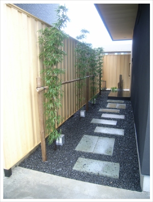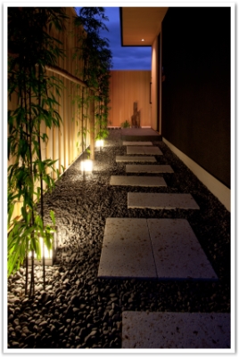 目隠しは白木を縦張りにした板塀でお隣とをしっかり仕切ります。 板塀を背景に等間隔に植えたクロチクは、夜のライティングで一層引き立ち、昼間とは違った幻想的でしっとりとした和風の空間を演出します。 |