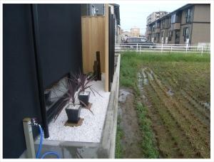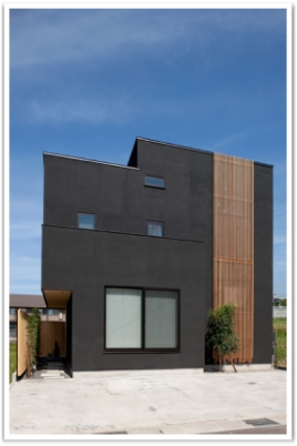 黒一色で統一された外壁の和モダンなお家。 外構には白木と石をふんだんに使ってシンプルに。 |