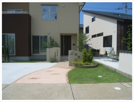 ピンク系のカラーコンクリートで可愛らしく、所々にレンガでアクセントを付けてあります。
