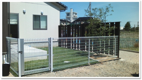 ワンちゃんのリードを外しても安心なように、メッシュフェンスで仕切りました。