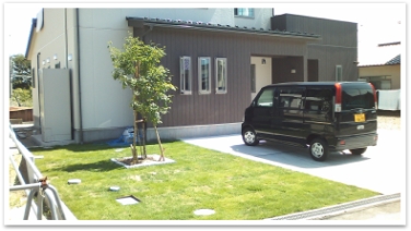 芝生の中央に作ったピンコロの花壇に植えたのは、風当たりの強い場所でも元気に育つ「アオダモ」の株立ちです。こちらのシンボルツリーのアオダモは、落葉樹なので秋には紅葉で色づいた葉を楽しむ事ができます。 |