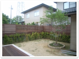 門袖の白色につる性植物の緑が映え、レンガの花壇に植えたシマトネリコの葉が、サラサラと風に揺れ爽やかな印象です。 |