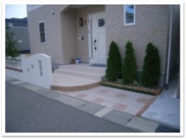 玄関ポーチに続く階段も、アールラインに縁取ったレンガと