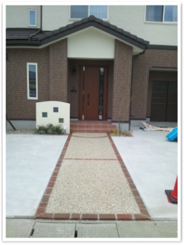 赤みのある茶色のレンガで縁取ったアプローチ。