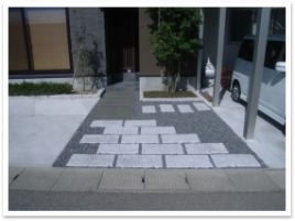 白御影の板石、黒御影のボーダー石、黒の那智石、花壇の縁石も白御影石と様々。