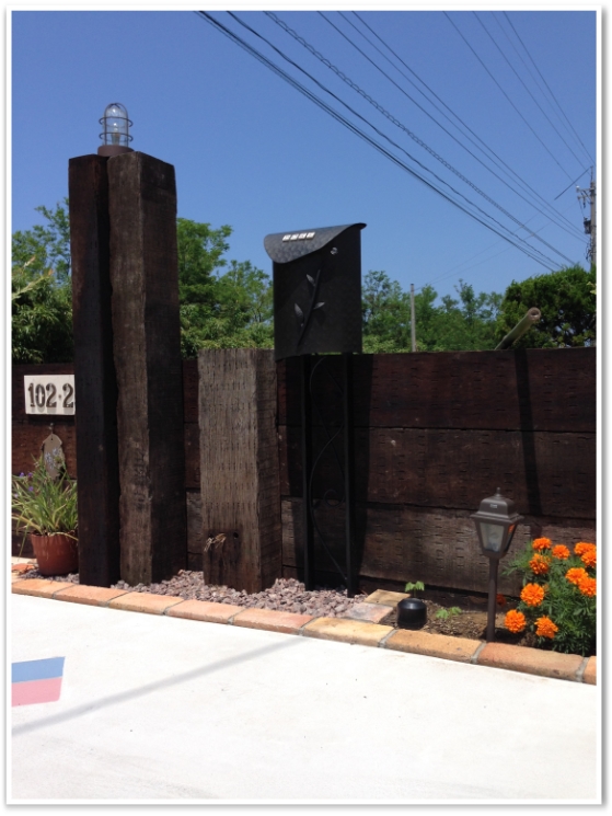 機能門柱にも枕木を使い、