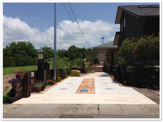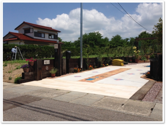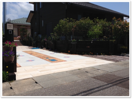 道路境界からは大判の白のタイル、駐車の際の目印になるよう真ん中は