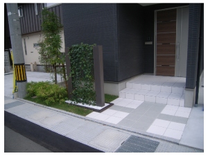 建物と同じくモノトーンでまとめたアプローチに植栽が加わり、緑の潤いが引き立つエクステリアです。 |
