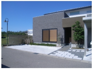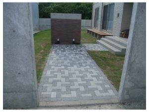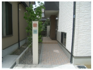 長いアプローチは2色を規則的に配置したインターロッキング敷き。機能門柱には表札と照明をで個性を持ったなシンプルな仕上がりです。。 |