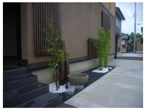 玄関アプローチ横の花壇に作った和モダンな坪庭で、お客様をお出迎えします。 |