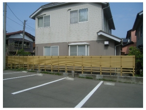 駐車場と庭との境にウッドフェンスを設置し、プライバシーを保ちます。 |