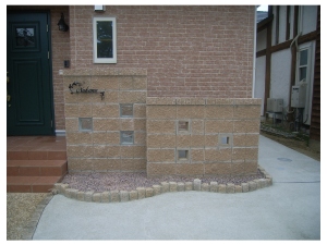 アプローチと門袖は色調を統一し、化粧ブロックにガラスブロックやアイアンフロートの表札などアイテムを取り入れ個性的な門袖に仕上がりました。 |