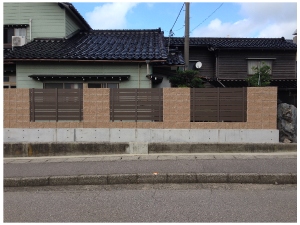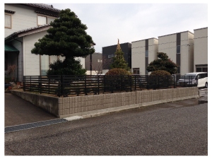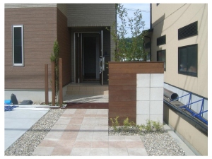 カイヅカイブキの垣根を撤去し、化粧ブロックとウッドフェンスを組合わせた目隠しにリフォームしました。 |