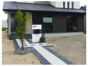 2色の御影板石敷き並べたエントランスは、石の素朴な風合いが素敵な重厚感ある仕上がりになりました。 |