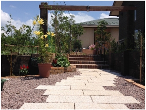 動線を考えた2方向に伸びるアプローチが特徴のお庭です。 |